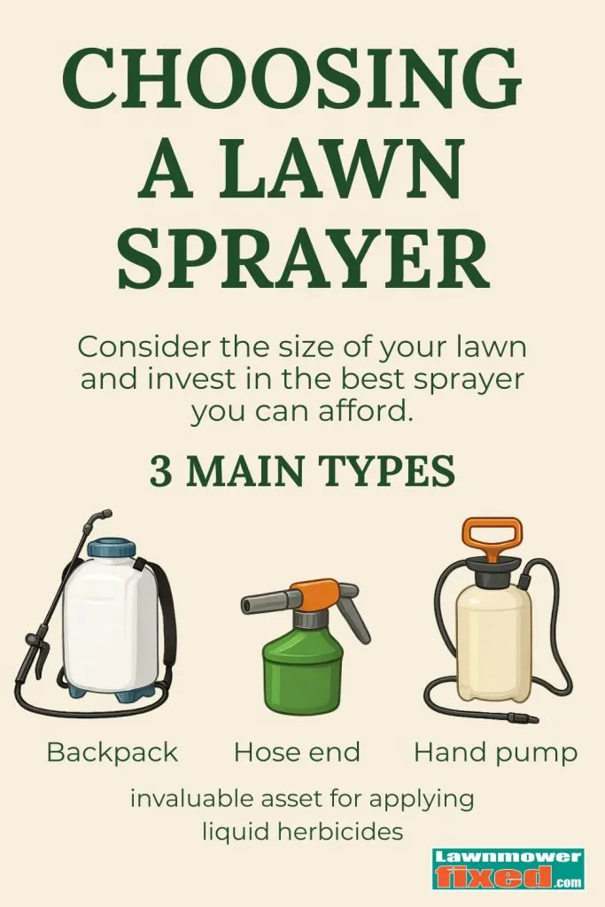There are three main types: backpack sprayers, hand pump sprayers, and hose-end sprayers.